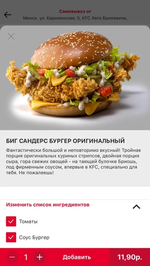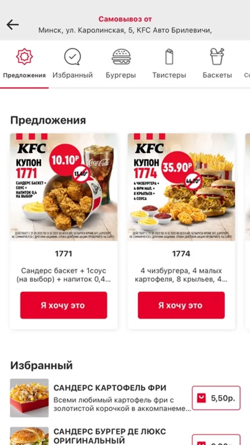 В этом приложении ты найдешь выгодные и актуальные предложения, сможешь оформить самовывоз и оплатить заказ онлайн, будешь раньше всех узнавать о новинках и акциях KFC в Беларуси. Заказать вкусную еду теперь намного проще. Сможешь найти ближайший ресторан с вкусной курочкой. Удобно и быстро!