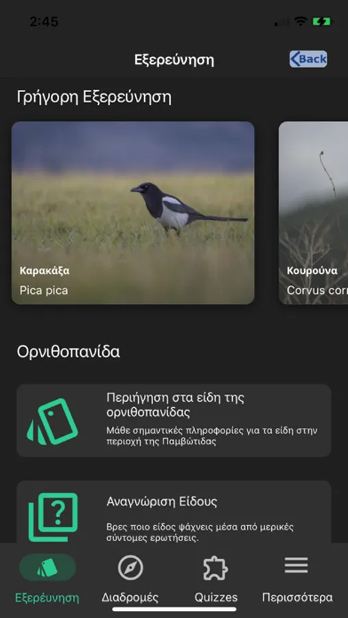 Μέσα από μια σειρά εικόνων, βίντεο και ήχων μπορείτε να περιηγηθείτε σε μερικά από τα πιο χαρακτηριστικά πουλιά της Ηπείρου και να ξεκινήσετε το ταξίδι της αναγνώρισης ειδών και της παρατήρησης πουλιών.