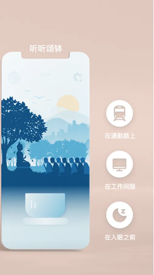 提供三种不同的使用模式:1.敲木鱼、2.转念珠、3.听颂钵