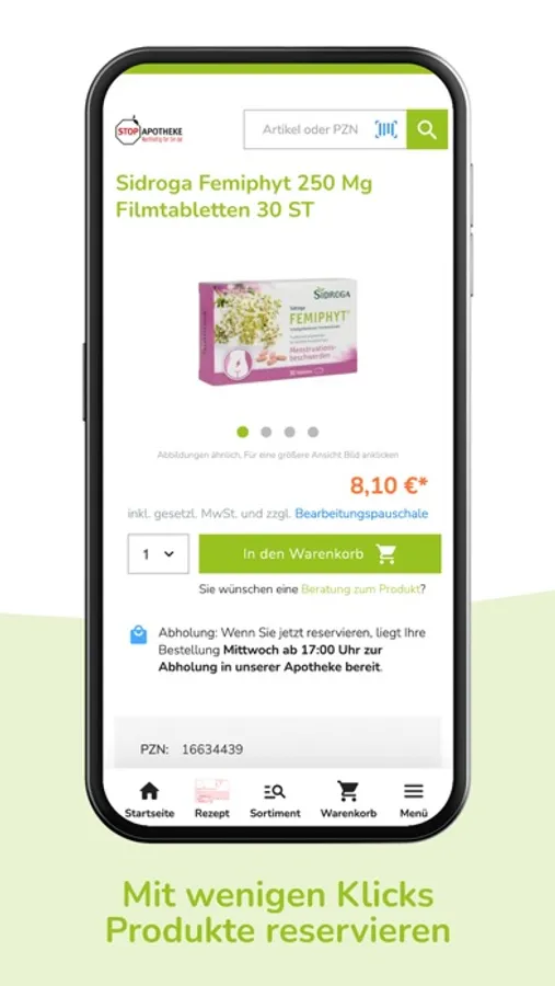 Bitte beachten Sie, dass wir bei apothekenpflichtigen Produkten zu einer pharmazeutischen Beratung verpflichtet sind. Die Beratung findet entweder bei der Abholung bei uns in der Apotheke, bei der Übergabe bei Ihnen zu Hause oder telefonisch statt.