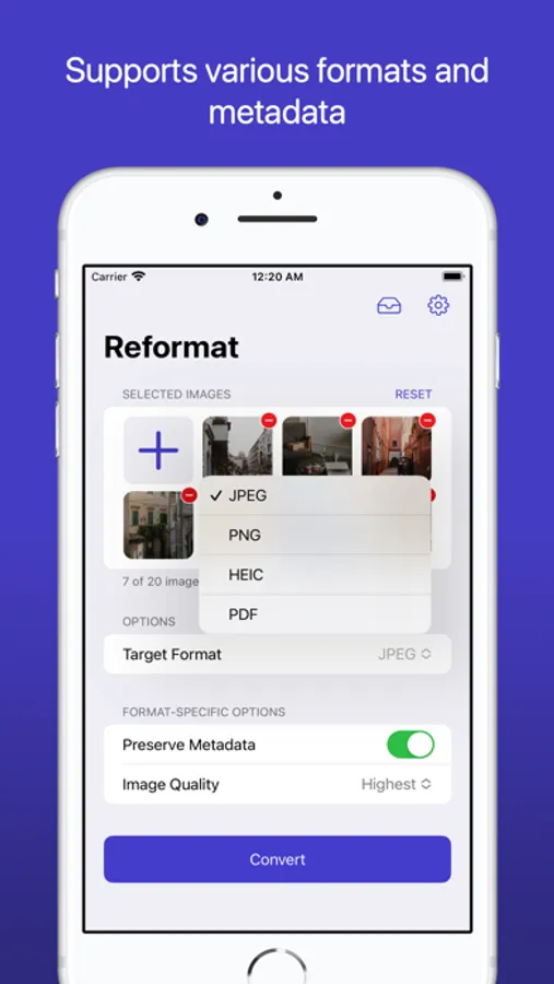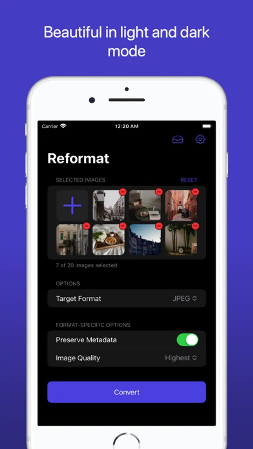 Reformat is a privacy-focused image converter which easily converts images on-device while keeping the original metadata. Your images do not leave the device during conversion, which means your data is safe at all times and the conversion even works offline.
