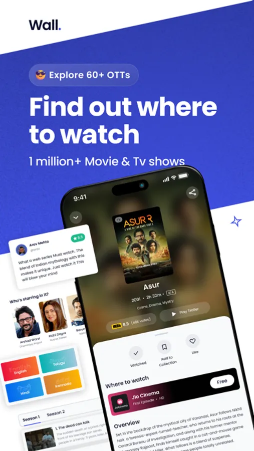 Wall is an innovative content discovery app that brings together titles from 60+ OTT Apps onto a single platform. With Wall, you will no longer have to search through multiple OTT platforms to find the content you want to watch. Instead, open the Wall app and browse through a wide range of movies, TV shows, documentaries, and more from your favorite OTT
