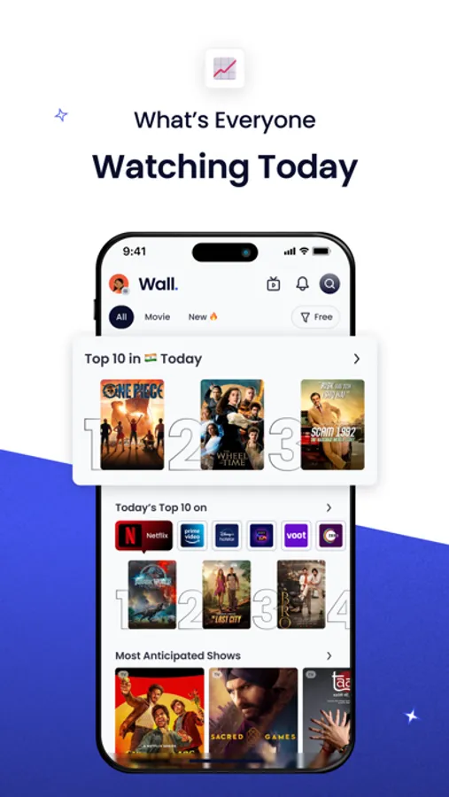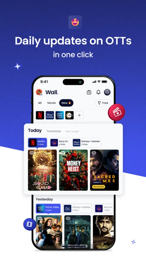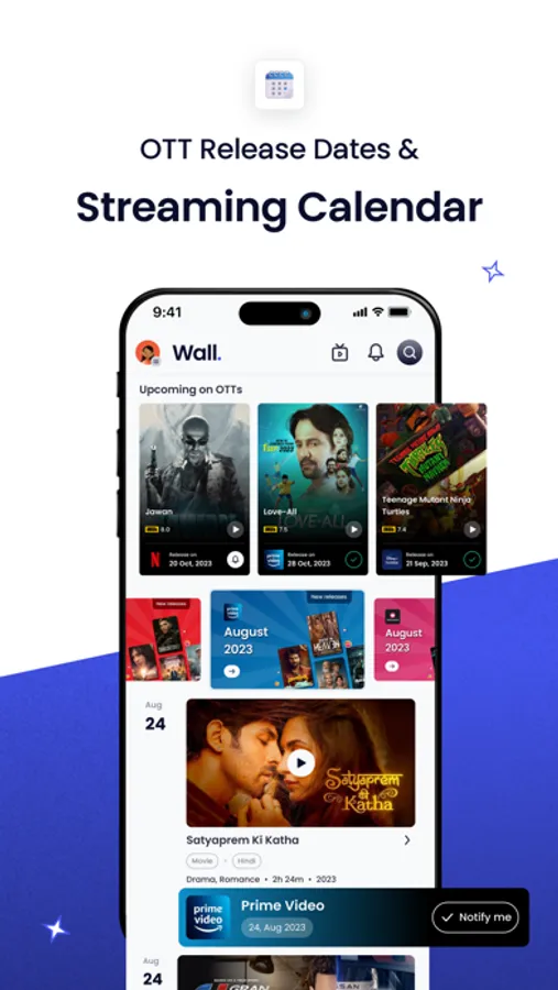 With Wall, stay up-to-date on the latest releases on popular OTTs. Our app makes it easy to discover newly released titles and see what's coming soon. Sort the upcoming and new titles OTT wise to see what's trending and new on your subscriptions. Get notified when new movies and web series releases, and you'll never miss out on the newest titles.