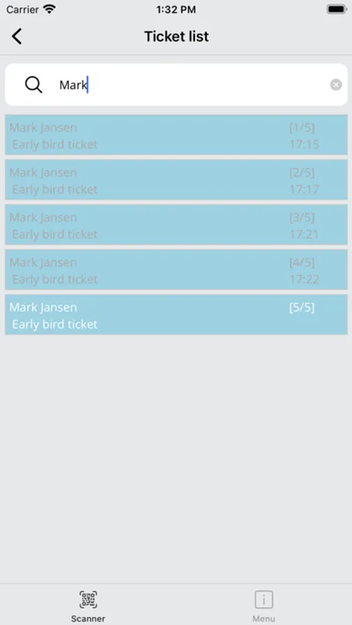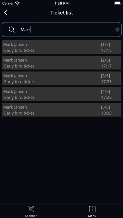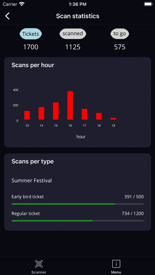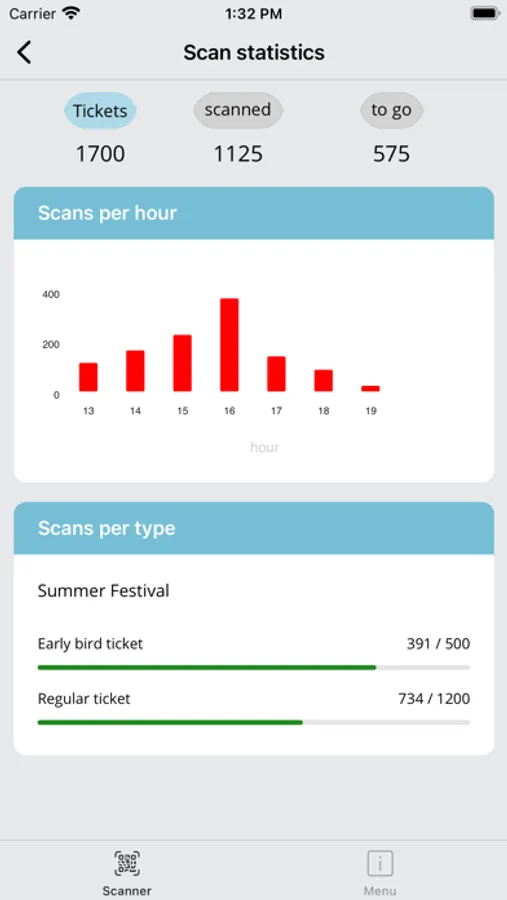 Additional features include real-time scan statistics, which display the number of scans per hour and per ticket type. The ticket list offers a quick lookup of visitors by name, while the filter enables you to select the specific ticket types and time slots you wish to accept.