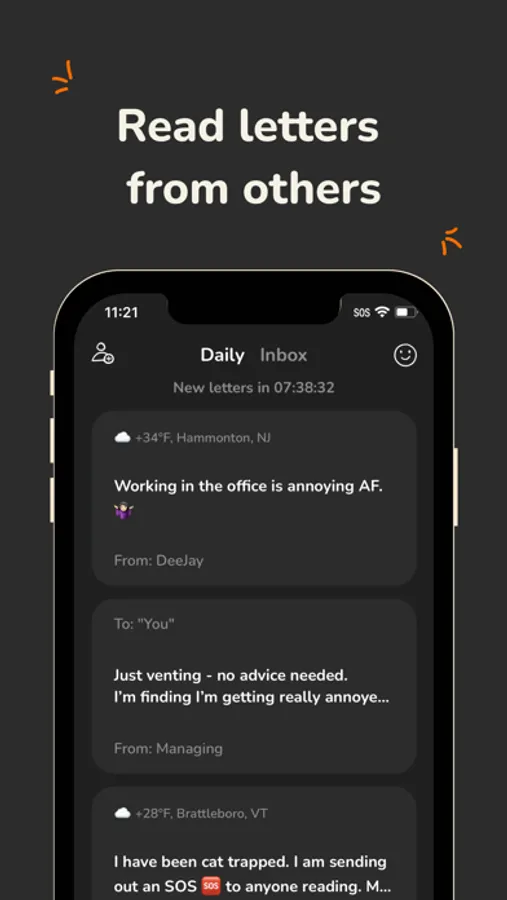 Have secrets, questions, struggles, thoughts, and untold stories? Write them down in anonymous letters and others will respond! You will receive 3 letters every night. Read others' letters and help them out.