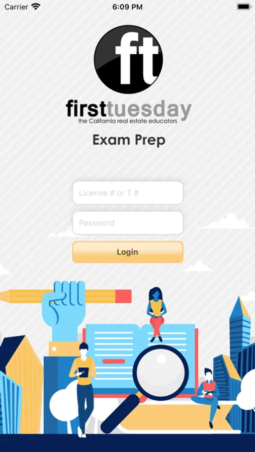 Once the ft Prep App has installed on your phone, log in with the same T# or DRE License # and password you use to log into your firsttuesday account online.