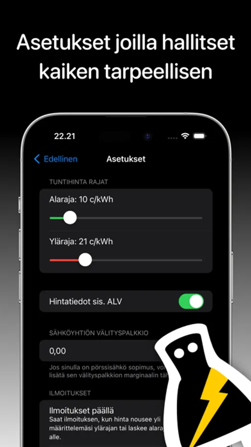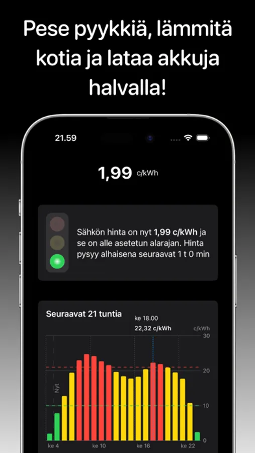 Enää ei tarvitse pelätä, että sähkön hinta yllättää, sillä voit asettaa ilmoitukset puhelimeesi, kun sähkön hinta pomppaa suureksi tai laskee alle halvan rajan. HattiWatt mahdollistaa huolettoman ja helpon elämän haastavassa sähkön markkinatilanteessa.