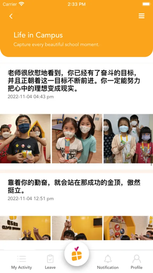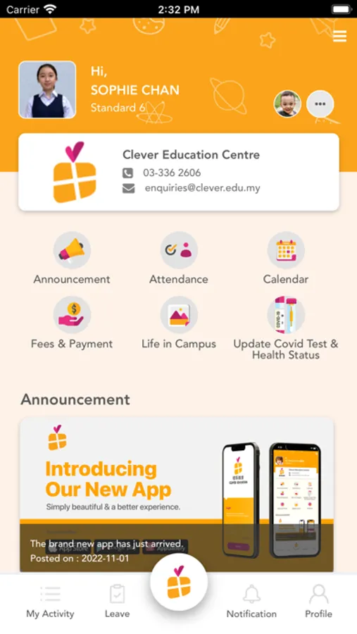 Through Clever Education App, you can look forward to amazing features such as easy sign in with temperature capturing, attendance reporting, announcement, reminders, push notifications, life in campus (photos & activities), class scheduling, progress reports, online billing, leave of absence, update of Covid-19 test results, update child profile, medications and allergies and much more.