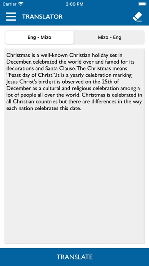 This is not only a dictionary but also a learning tool. You can use it without Internet and carry a big dictionary wherever and whenever you go in just a small smart phone. Translator and text to speech is also available for the users. When you start typing, you will see some words starting with the letters you typed. This application will be helpful to any students or non students to find out the meaning of any word. This dictionary can also be known as the English Mizo dictionary or Mizo English dictionary.