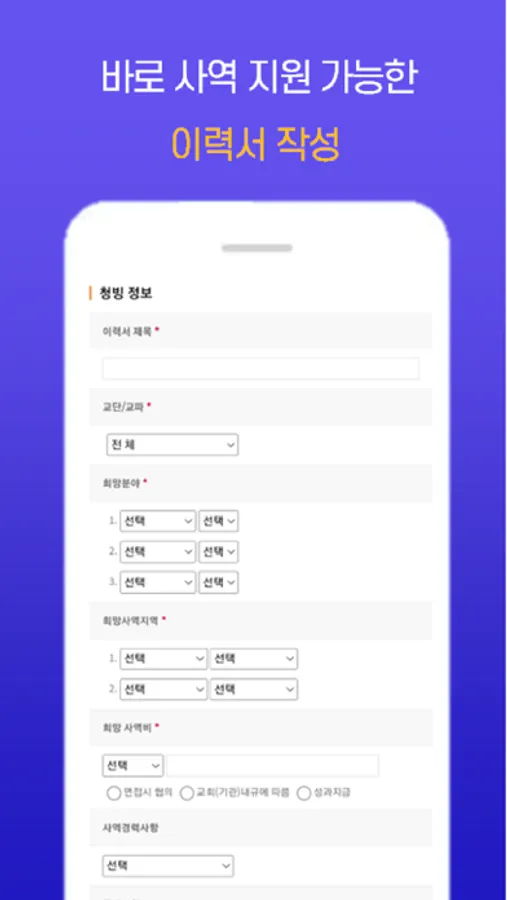- 청빙만의 특별한 사역자 전용 이력서를 작성해보세요!