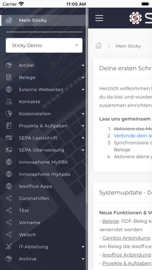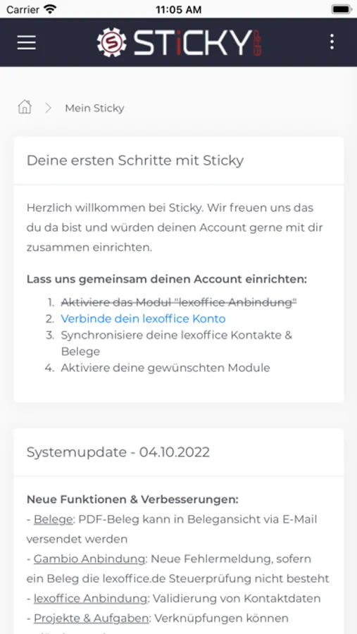 Sticky® ist eine Cloud-Anwendung, um Arbeitsprozesse in allen Bereichen zu automatisieren, tägliche Arbeiten zu vereinfachen und zu zentralisieren. Sticky ist für alle Branchen und Betriebsgrößen geeignet. Das Basissystem besteht aus gängigen Grundbausteinen wie z. B. die Kontakt- oder Artikelverwaltung. Mit Sticky können aber auch ganz individuell eigene Datenstrukturen angelegt werden, sei es für die eigene Fahrzeugflotte oder für die Verwaltung von Immobilien. Je nach Bedarf und internen Abläufen können passende Module für verschiedene Aufgabengebiete, z.B. das Erstellen von Serienrechnungen und das Erfassen von Kostenstellen, gebucht werden.