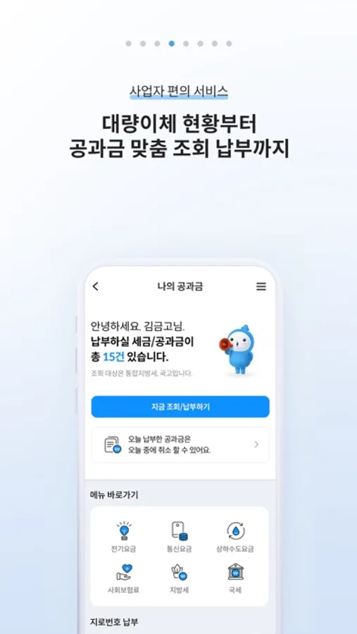 - 나의공과금 : 제세공과금 맞춤 조회 및 자동납부 등록 기능 제공