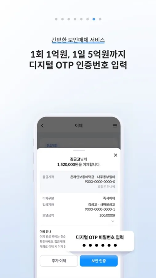 - 간편 보안 : 개인사업자 고객 대상으로 디지털OTP(1회 1억원, 1일 5억원 한도) 보안매체 제공