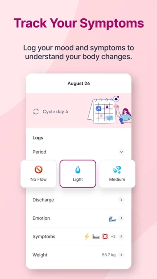 You can see Kompanion Period Tracker as a true cycle and fertility friend that keeps track of every detail about your reproductive health and offers tips to make you feel better and healthier. Log your PMS and period symptoms, spotting days, vaginal discharge, and mood swings during your cycle. It’s simply your health diary.