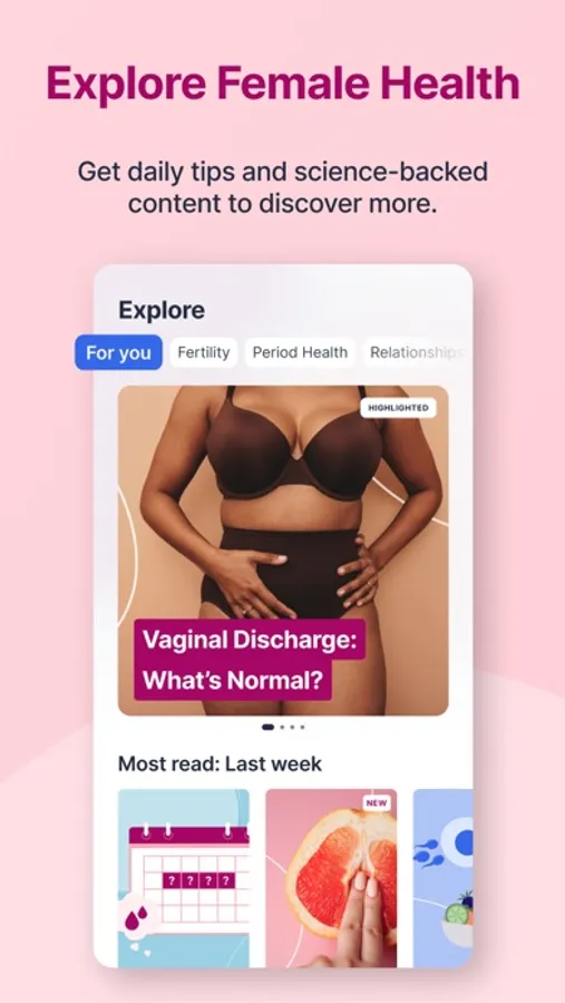 Connect with your unique body and increase your knowledge about your reproductive health. Get answers to your potential questions with our science-backed information on several categories concerning female health: period health, fertility, medical issues, sex, nutrition, psychology, relationships, exercise, and 40+.