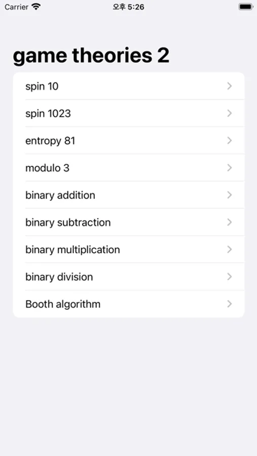 game theories 2 is the container app. It has 9 apps; spin 10, spin 1023, entropy 81, modulo 3, binary addition, binary subtraction, binary multiplication, binary division, Booth algorithm. Enjoy the games!