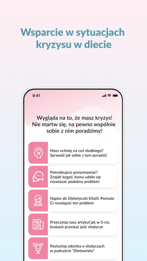 W aplikacji znajdziesz także gotowe rozwiązania w sytuacjach kryzysowych. Dopadła Cię nagła ochota na coś słodkiego? Skorzystaj z programu wsparcia, w którym znajdziesz gotowe wskazówki jak poradzić sobie z kryzysem, ale także możliwość skontaktowania się na czacie z naszym dietetykiem. Przestrzegasz diety, ale nie widzisz jej efektów? Dowiedz się jakie mogą być przyczyny i jakie rozwiązania przygotowali dla Ciebie nasi specjaliści.
