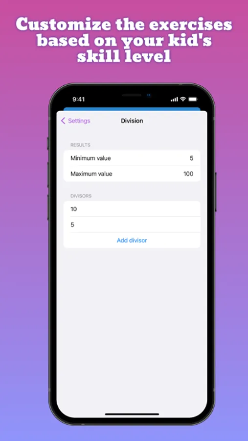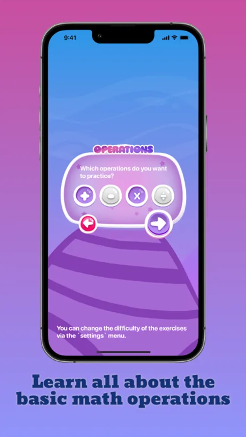 All basic operations are supported (addition, subtraction, multiplication & divisions) and all exercises can be tailored to the skill level of your child.