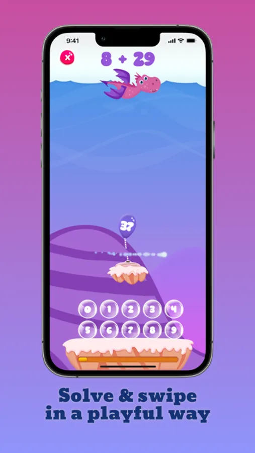 Let your child fall in love with the magic of math by dragging the correct numbers to the balloon, then cut the rope and let the balloon fly to Paulie the Plusosaurus!