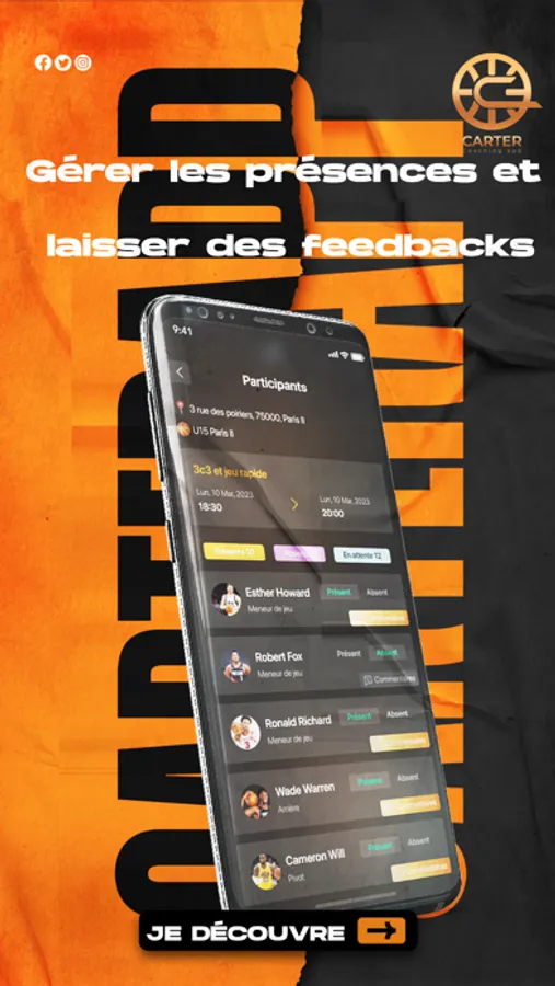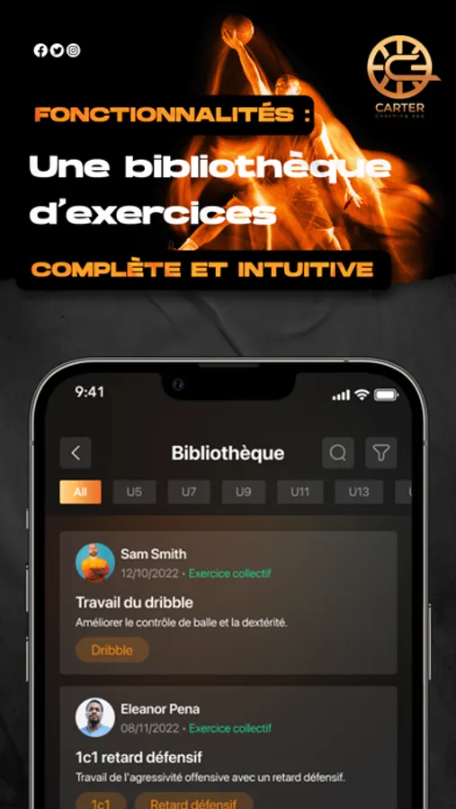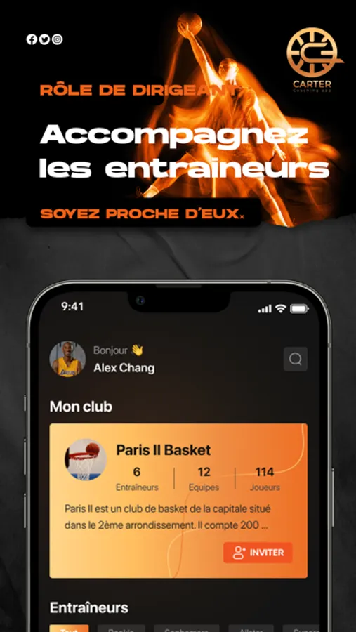 "Carter - Coaching App c'est l'application indispensable pour les dirigeants, les entraîneurs et les joueurs de basket. Profitez d'un outil de gestion d'équipe vous permettant de gagner un temps incroyable sur l'organisation de votre saison et améliorez grandement l'investissement de vos joueurs ainsi que leur progression.
