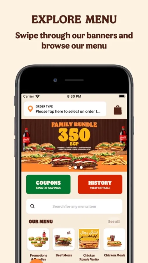Here’s just some of the features you’ll find in the BURGER KING® Egypt Home Delivery App: