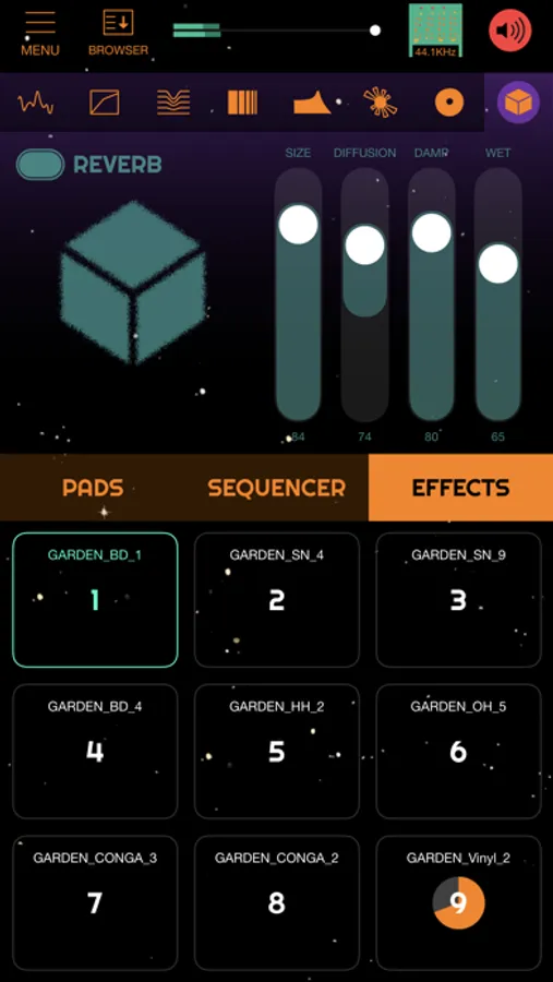 - Reverb, Delay, Compressor, Flutter, Gate, Tremolo, Noise, Filter, Chorus, Equalizer, Stutter and Tape slow motion.