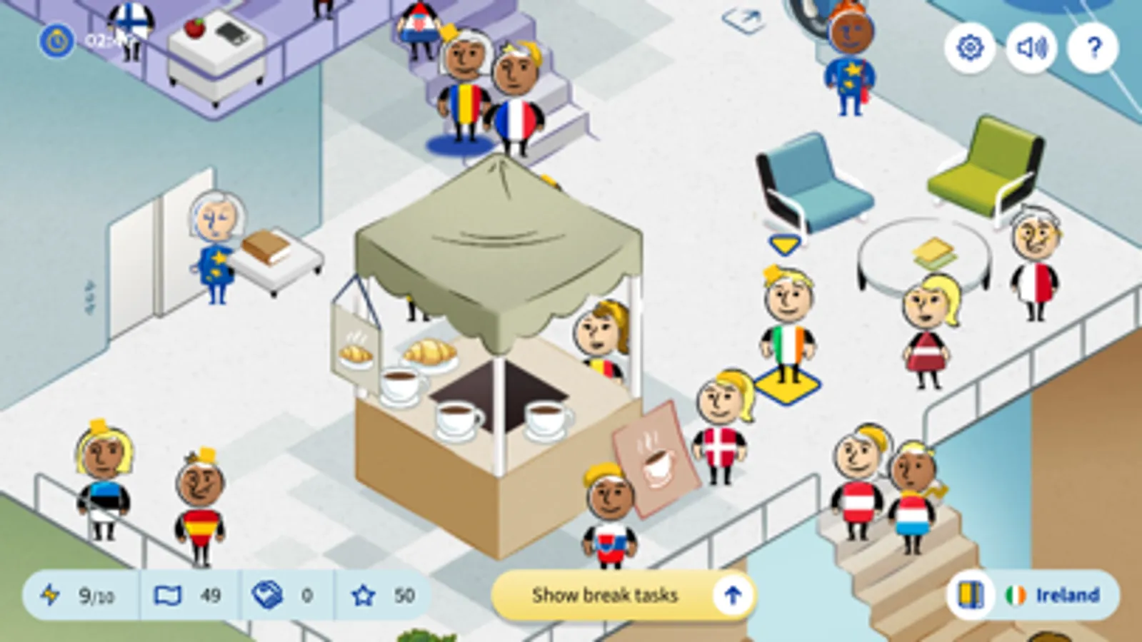 Win or lose action points by interacting with the other member states, but choose your actions wisely, as your negotiation powers are limited. You can replenish your points through trivia quizzes and mini-games during breaks between the negotiation rounds.