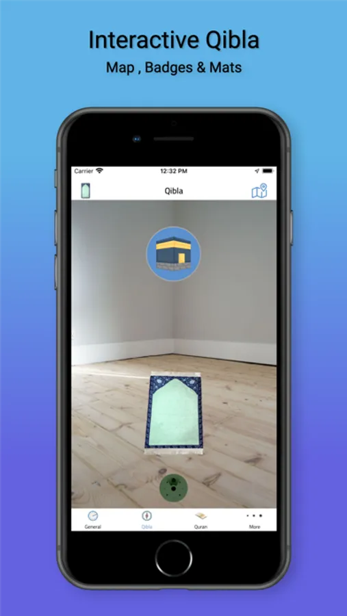 • Qibla pointer towards Makkah with an interactive mat and a map showing the path.