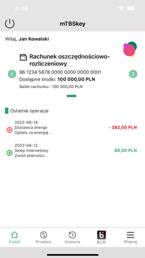 Aplikacja umożliwia obsługę rachunków bankowych na urządzeniach mobilnych.