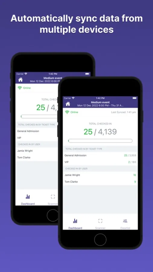 - Automatic synchronisation allows you to check in tickets on multiple devices at once to speed up door entry.