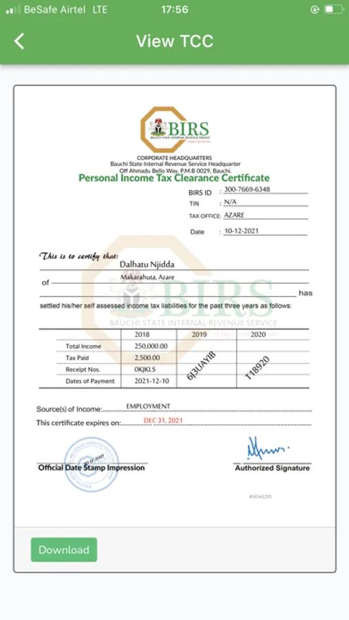 Bauchi State Internal Revenue Service mobile app enables Bauchi state taxpayers to track TCC application process, seek for online support and locate the closest BIRS office.