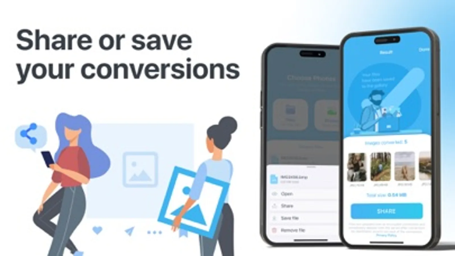Save finished images to your gallery or share them on social networks. View the history of your previous conversions.
