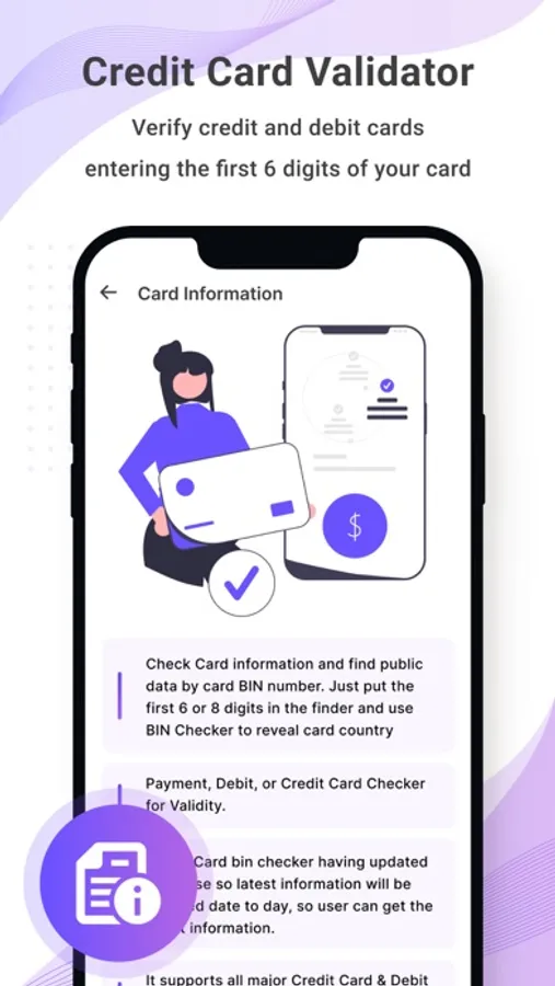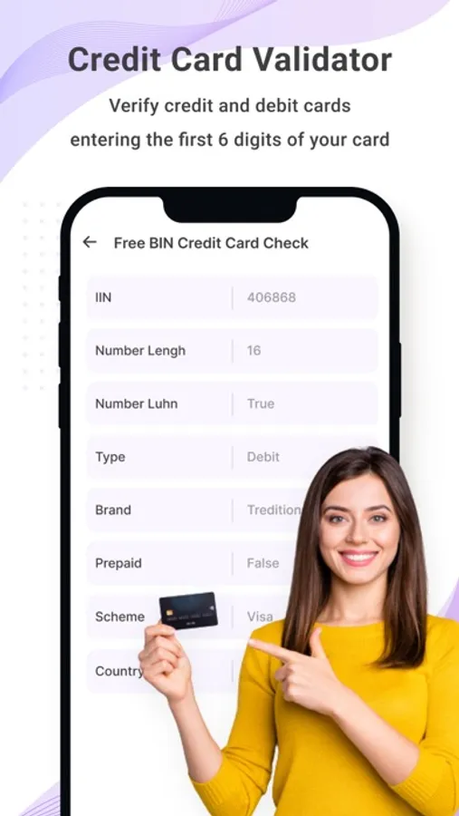 Free Credit Card BIN checker useful application to find credit card details such as Card Type, Country Issue Bank etc using BIN number (first 6 digit of card).