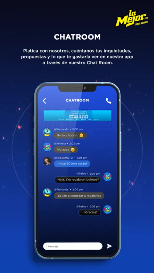 Llega para ti la app más importante del regional mexicano. En esta, además de poder escuchar todas las estaciones de La Mejor FM en un mismo lugar, podrás chatear de forma directa con tus locutores favoritos de toda la cadena en tiempo real, participar en las dinámicas exclusivas para ganar premios únicos en todo el territorio de la cadena más importante de la música grupera. Podrás ganar convivencias con tu artista favorito, boletos para los mejores conciertos, encontrarás la actualidad del mundo del espectáculo, los mejores contenidos de la radio a tu smartphone y podrás ser parte de lo que suena en La Mejor FM, eligiendo las canciones del momento.