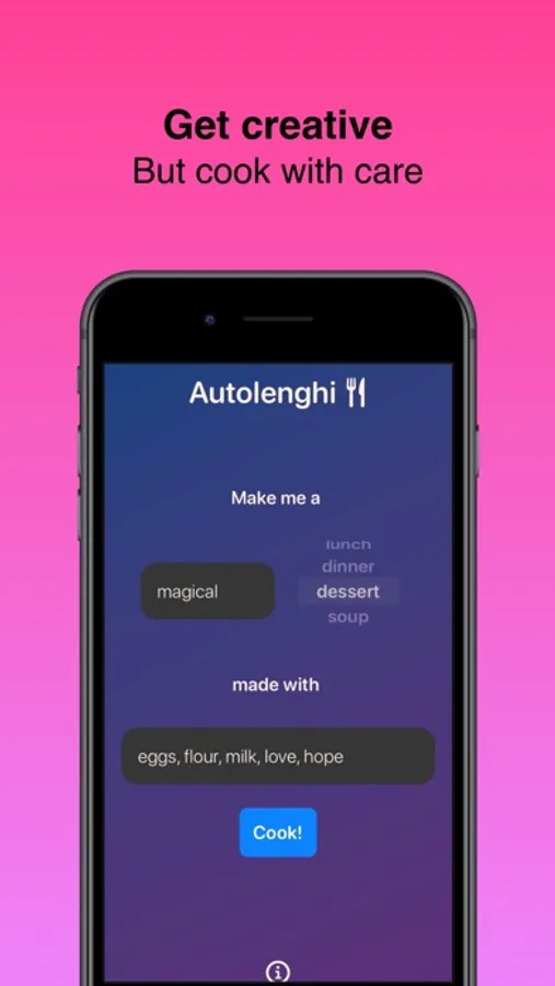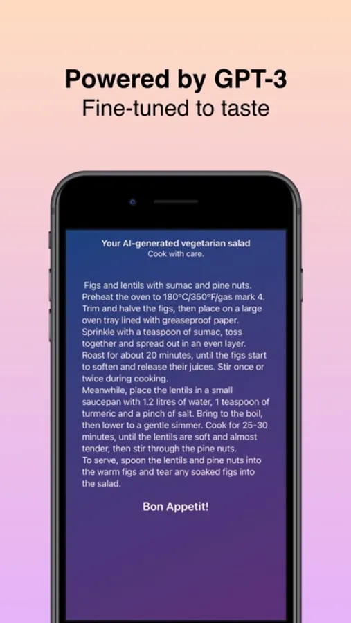Cook recipes that have never been cooked before! Autolenghi is an AI-system that automatically generates recipes based on your wishes. All you need is an adjective and a list of ingredients, and you can start cooking!