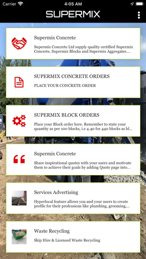 Supermix App is for Supermix customers providing a 24/7 ordering service and quotations for sand and gravel, Supermix concrete, concrete blocks and waste recycling. Keep up to date with the latest products and services.