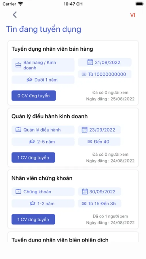 • Tìm việc làm & Ứng tuyển nhanh chóng qua một chạm, CV tự động gửi tới Nhà tuyển dụng không cần qua email