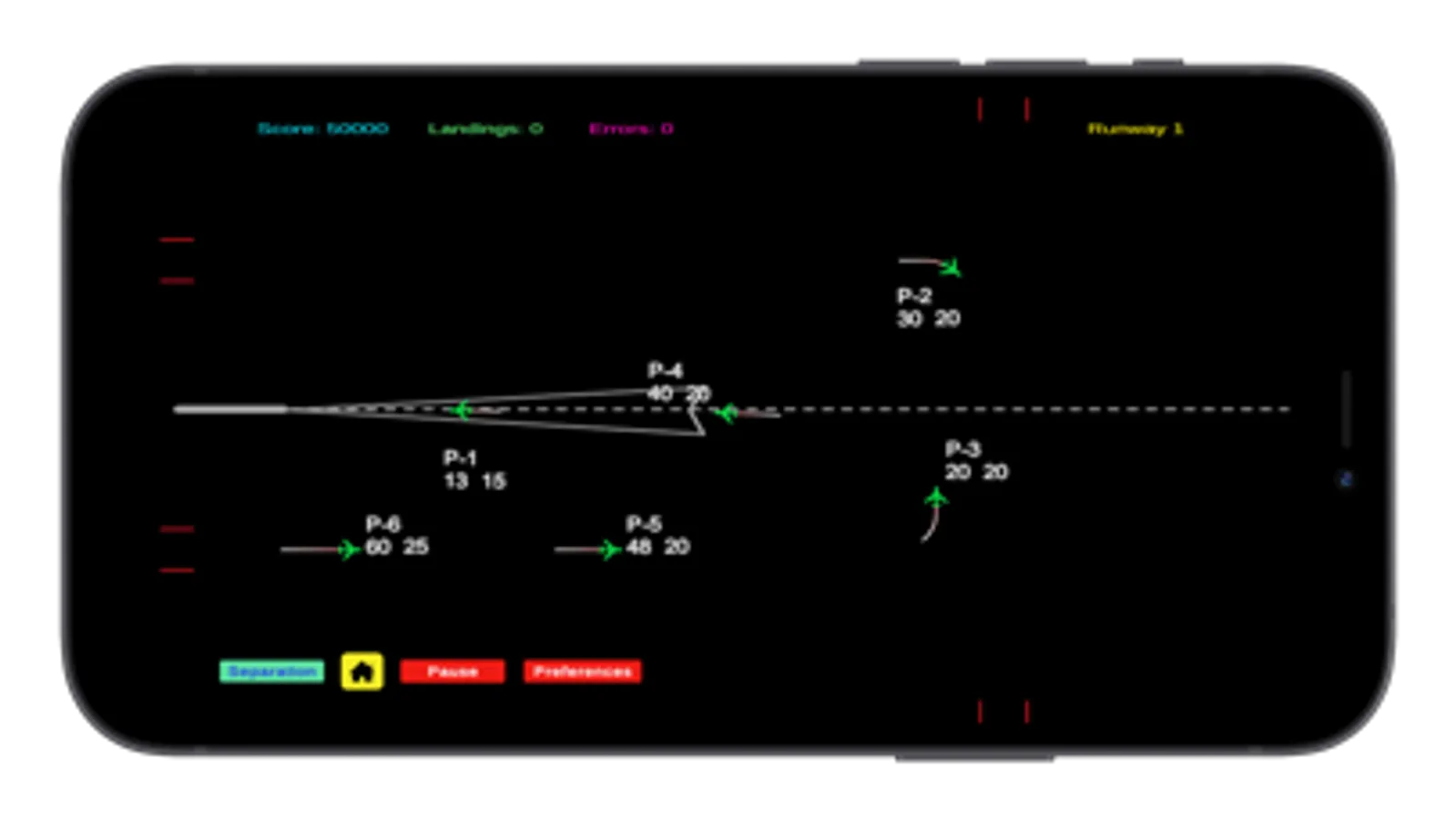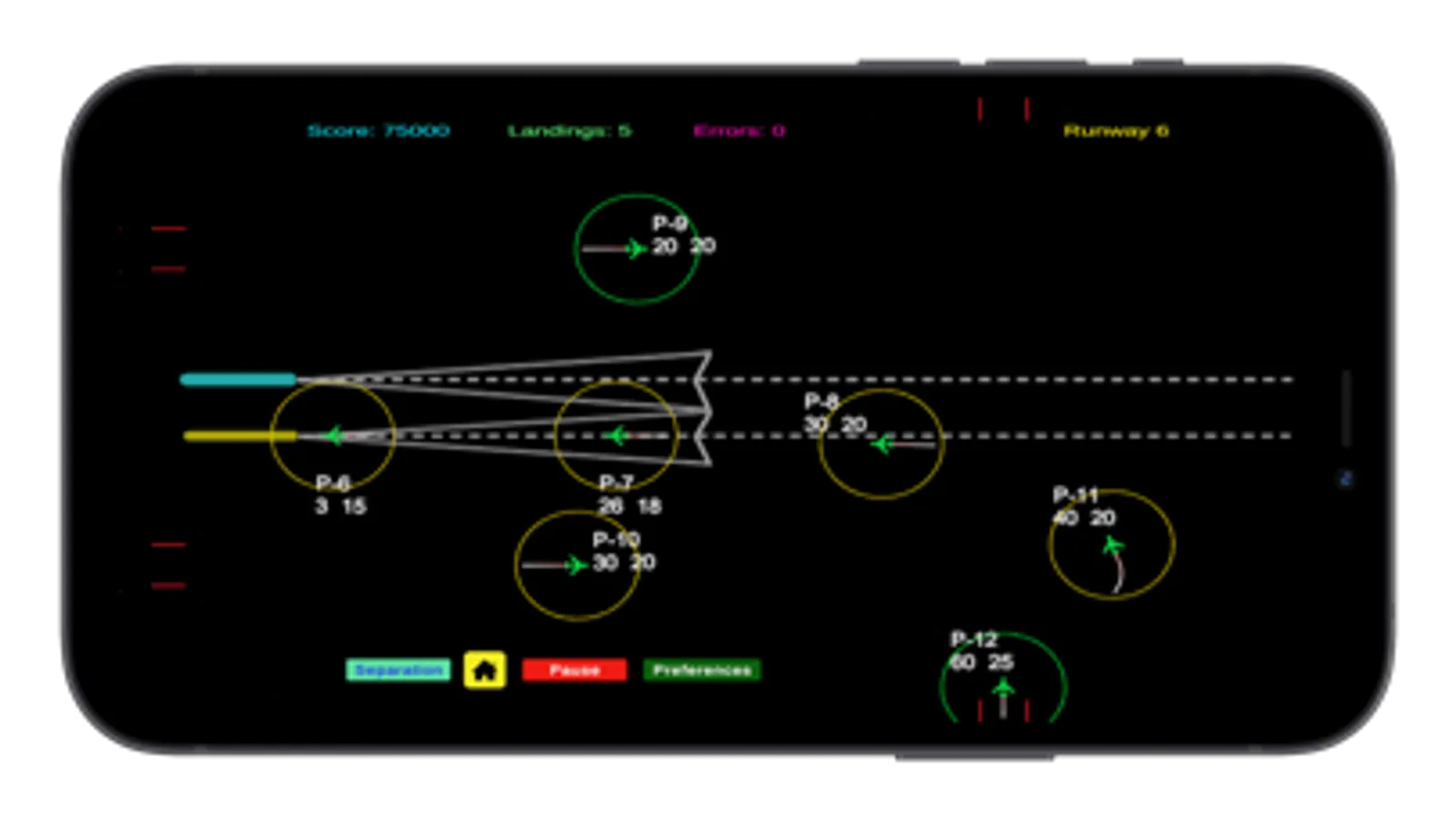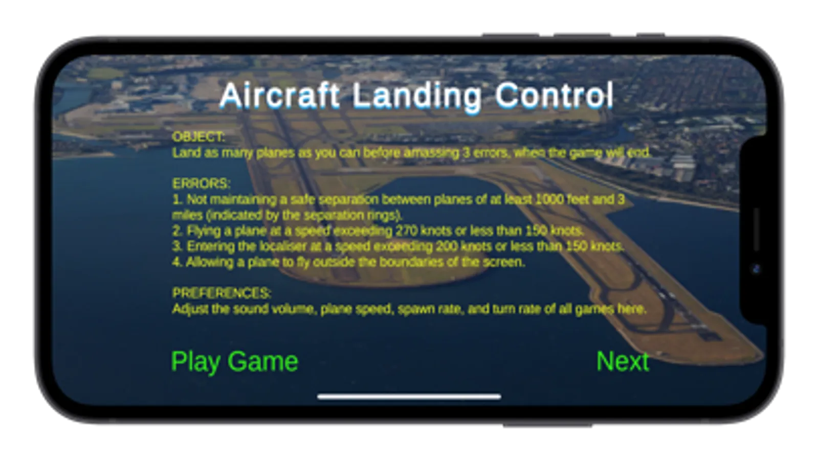 Maintain a safe separation between planes of 3 miles or 1000 feet or incur an error. Errors are also incurred by exceeding a speed of 270 knots, by allowing a plane to fly off screen and entering the localiser at speed exceeding 200 knots or a height that is not between 2000 and 3000 feet.