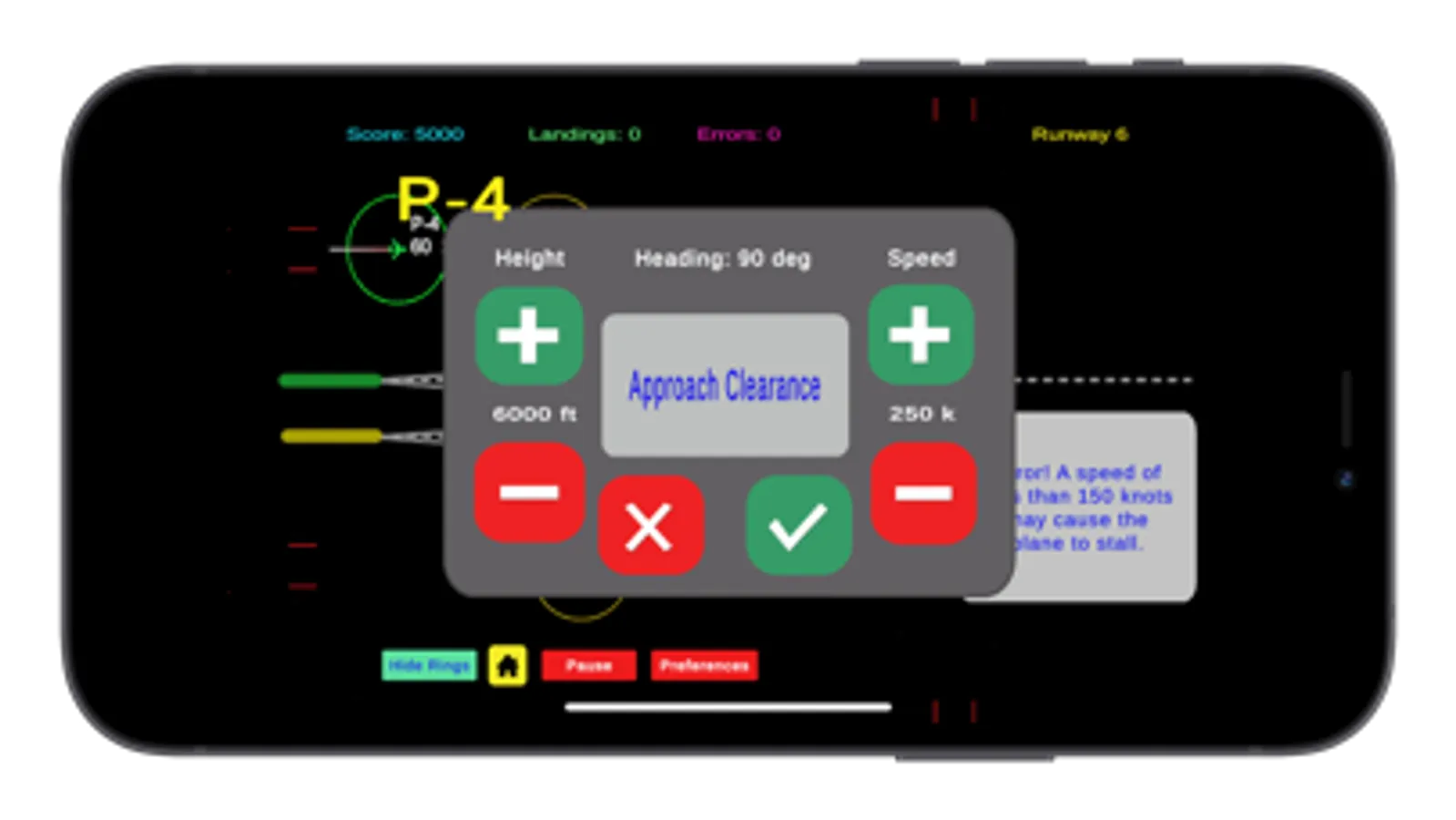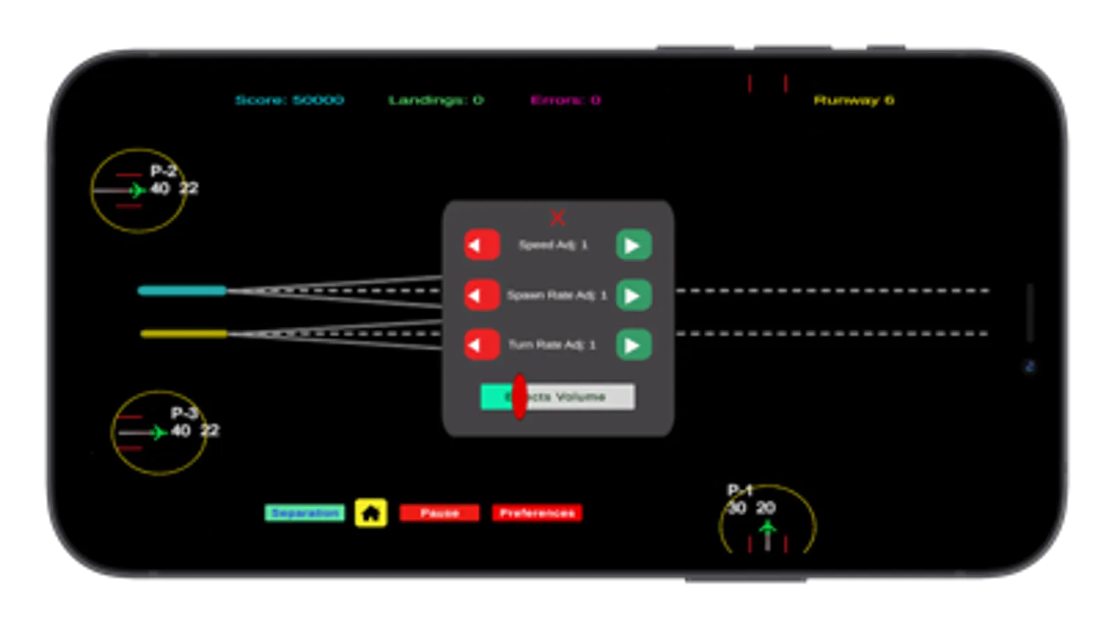Aircraft Landing Control loosely simulates the actions of an air traffic controller. Land as many planes as possible before incurring 3 errors. 6 runways are provided, one free and the remainder available to purchase. Each runway presents different challenges and, through Preferences, the player can modify the game’s difficulty. Preferences are only available if the game has been purchased.