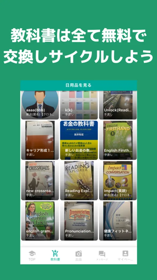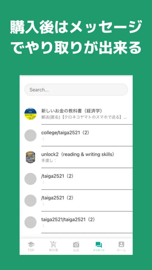 使わなくなった教科書を次に必要な人に無料で譲り自分も譲ってもらえる、その後メッセージでの会話で講義の内容や、雰囲気を知りスムーズに講義に参加しよう