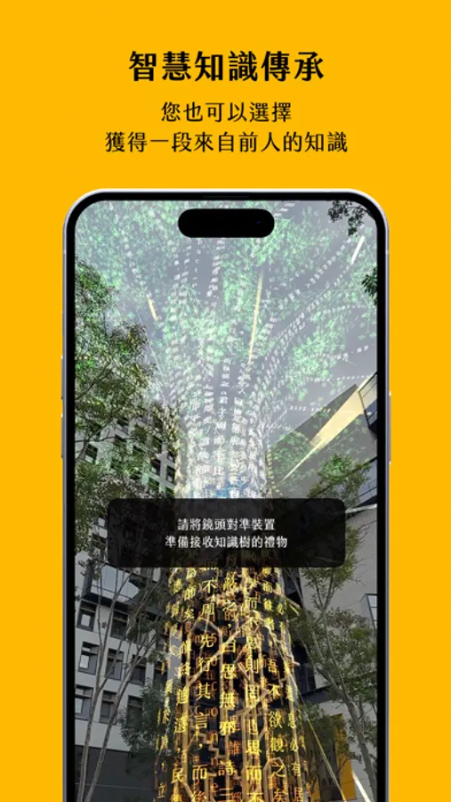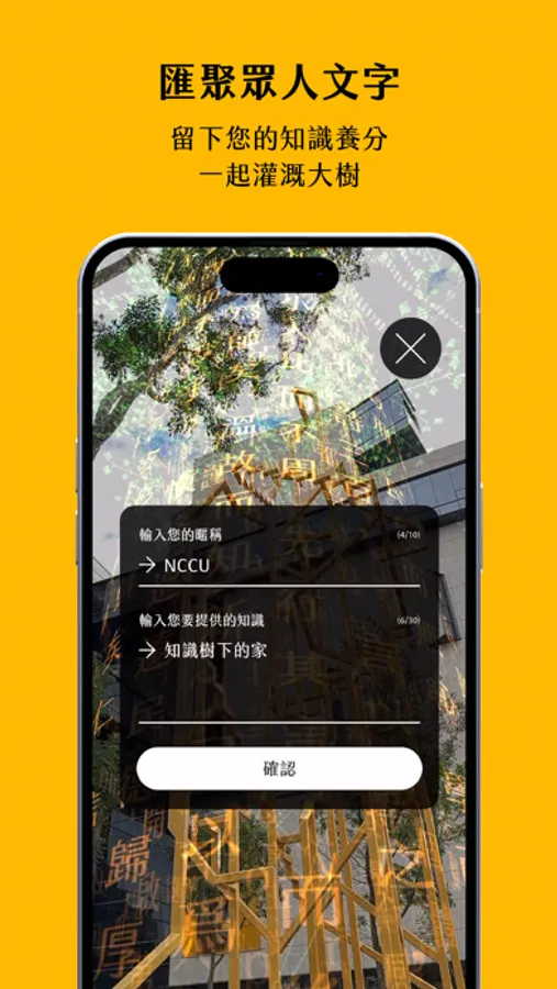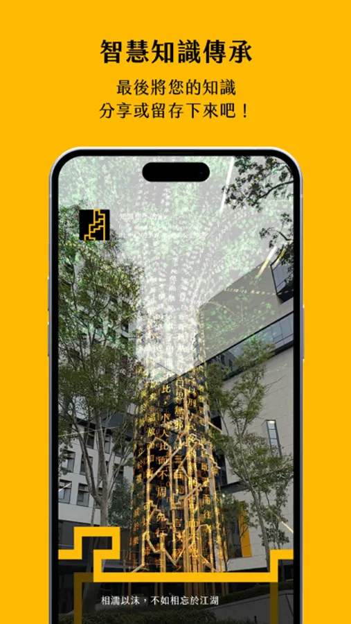 「知識樹下的家」是一件虛實合一的作品,位於公企中心戶外廣場,作品以當代線條帶來複合家屋的意象,用人、家、企三字來建構造型。在 AR 虛擬世界中,創建一座參天大樹,觀眾可留下新生文字,即時生成在畫面中,看見匯聚的生長,無限循環,生生不息,逐步長成豐厚的知識之樹。