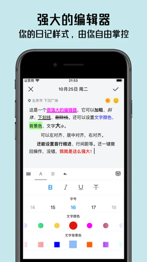 【富文本编辑器】支持粗体、斜体、下划线、删除线、字号、文字颜色、文字背景色、首行缩进、居左/中/右对齐、行间距等样式。