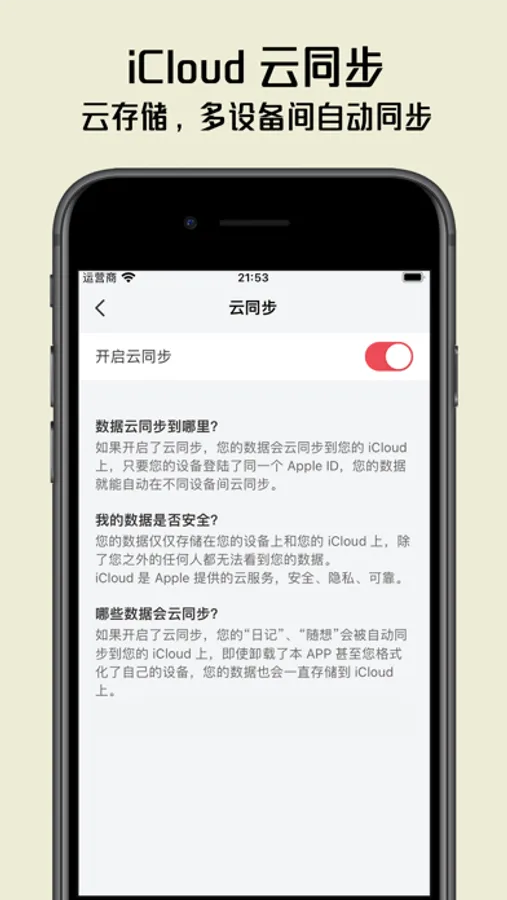 【云同步】支持 iCloud 云存储,多设备间可以自动同步,日记更加私密、安全。