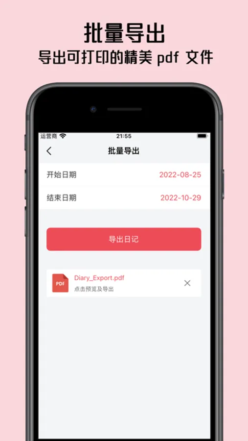 【批量导出】支持批量导出日记,导出可打印的精美 pdf 文件,装订成册更美观。还可以导出精美的图片,分享日记更简单。