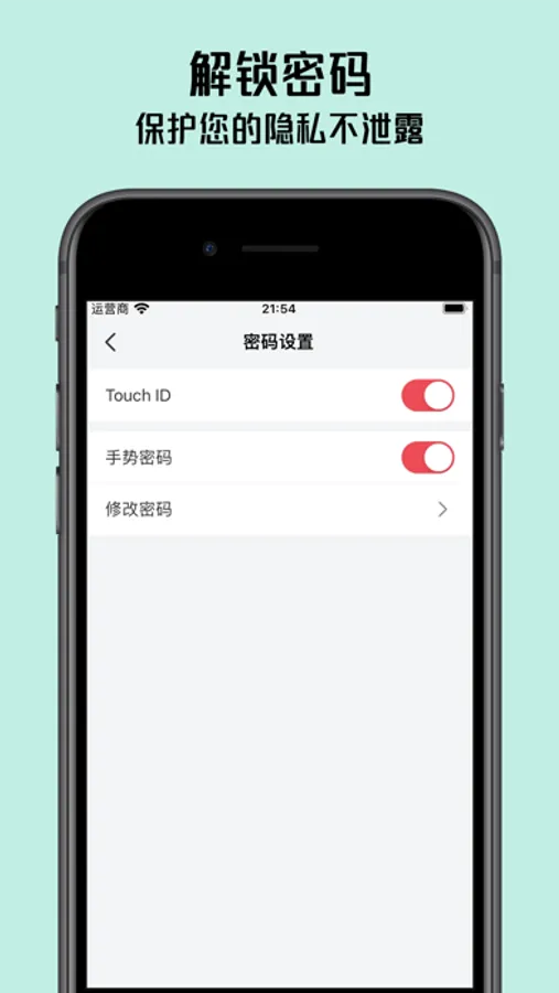 【解锁密码】支持设置手势解锁、Face ID/Touch ID 解锁,保护您的隐私不泄露。