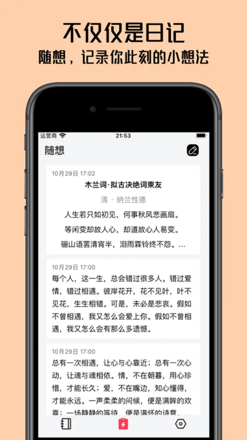 【不仅仅是日记】可以在“随想”页面,随时随地记录你的小想法,同时也支持和日记一样强大的编辑器。