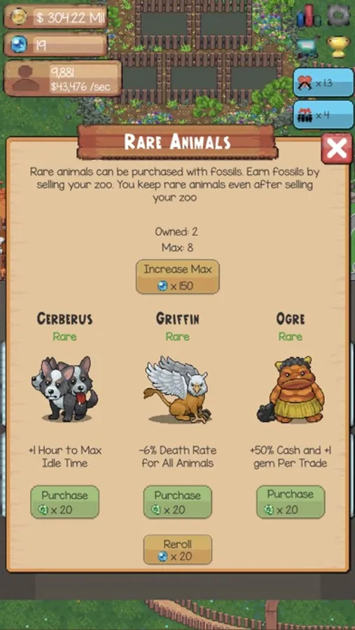 • The Rare Animals like Werewolf, Dodo, Shinigmi, Alien, Big Foot, Unicorn,…can be purchased with fossils. You earn fossils by selling your zoo and keep the rare animals even after selling your zoo.