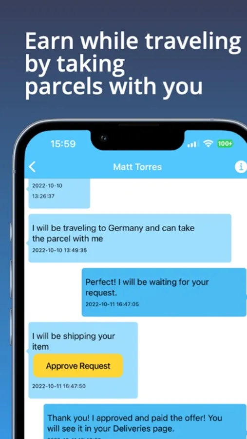 - Travelers will view the parcel from their destination and will send a request to ship it with them