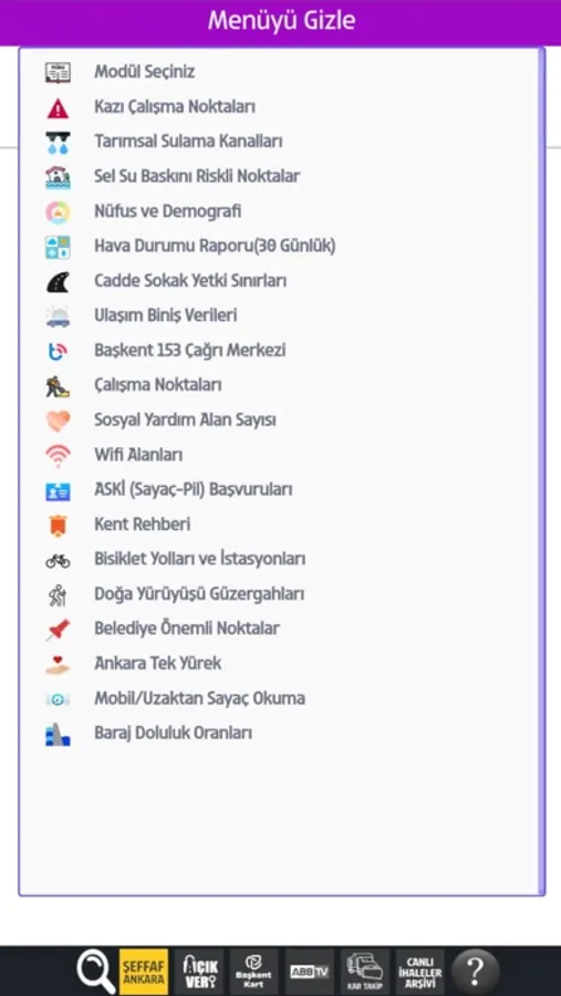 Çağdaş ve modern şehircilik anlayışına uygun olarak Ankara'nın demografik ve kültürel yapısı, Belediyemizin hizmetleri, çalışmaları ve şehrin dinamikleri hakkında birçok veriye sahip bir uygulamadır.