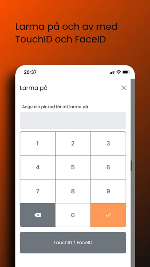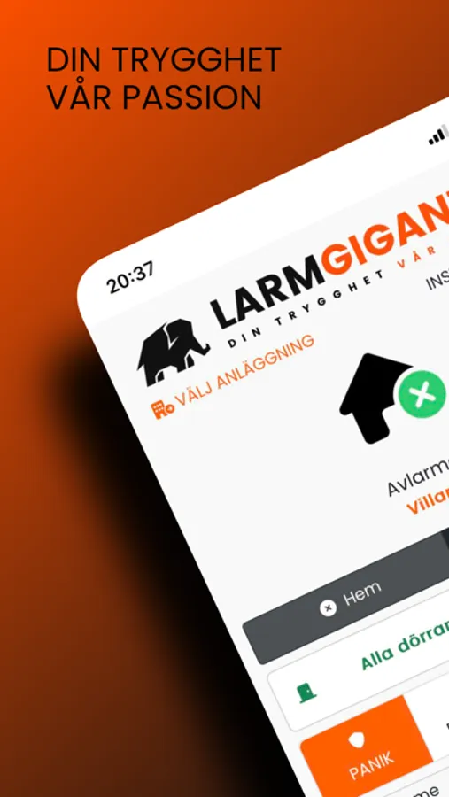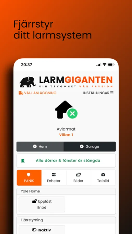 Med Larmgiganten's app kan du fjärrstyra ditt larmsystem, Låsa upp/Låsa Yale Doorman, Sätta på/Stänga av smartplugs och Larma på/Larma av.